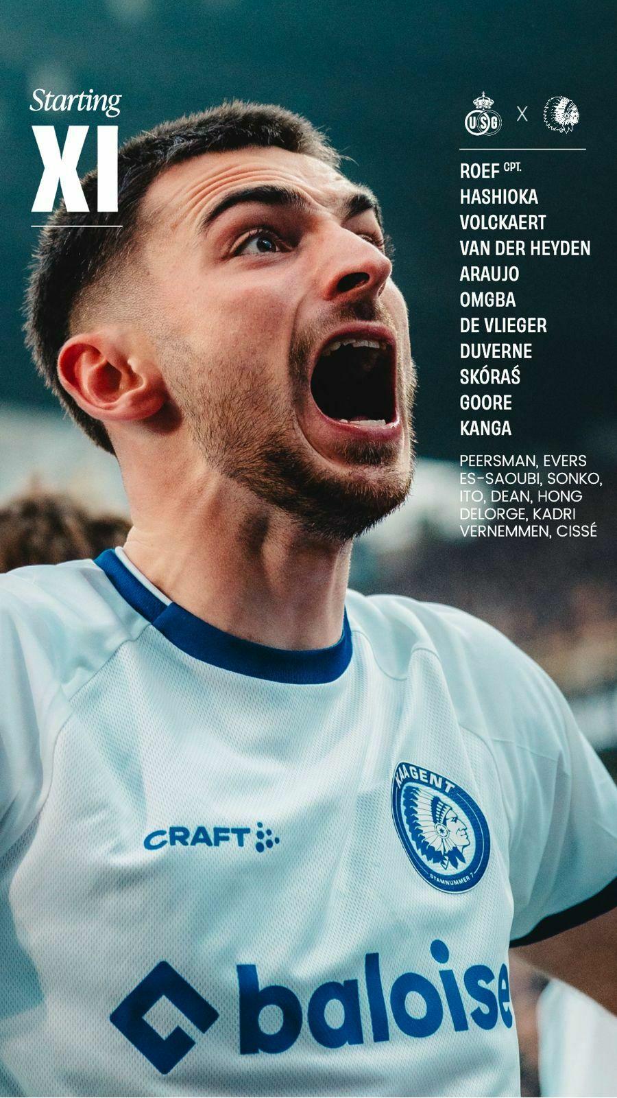 De opstelling van KAA Gent, u aangeboden door Canon: Roef, Hashioka, Volckaert, Van der Heyden, Araujo, Duverne, De Vlieger, Omgba, Skóraś, Goore, Kanga