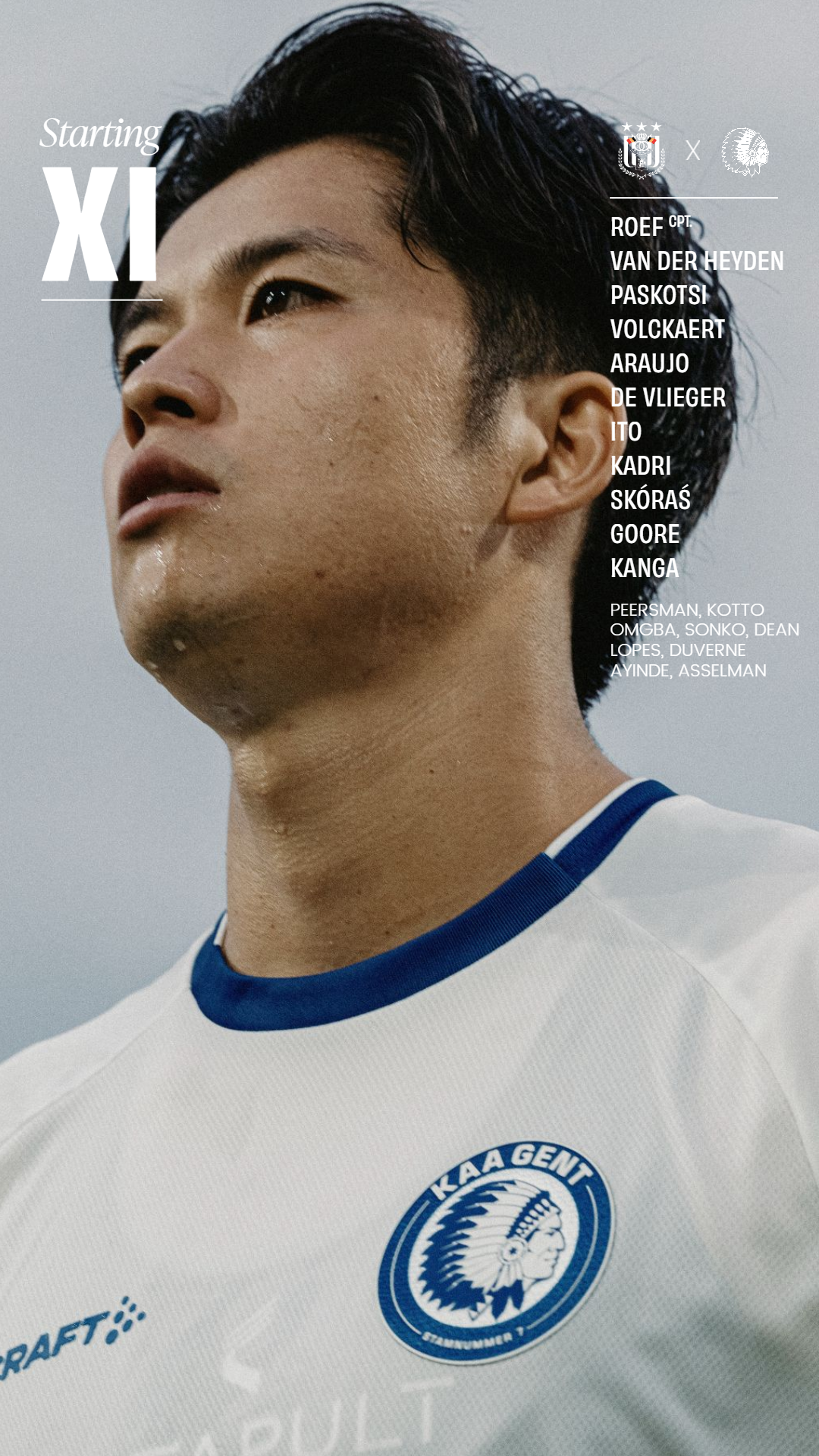 De opstelling van KAA Gent, u aangeboden door Canon: Roef, Van der Heyden, Paskotsi, Volckaert, Araujo, De Vlieger, Ito, Kadri, Skóraś, Goore, Kanga.