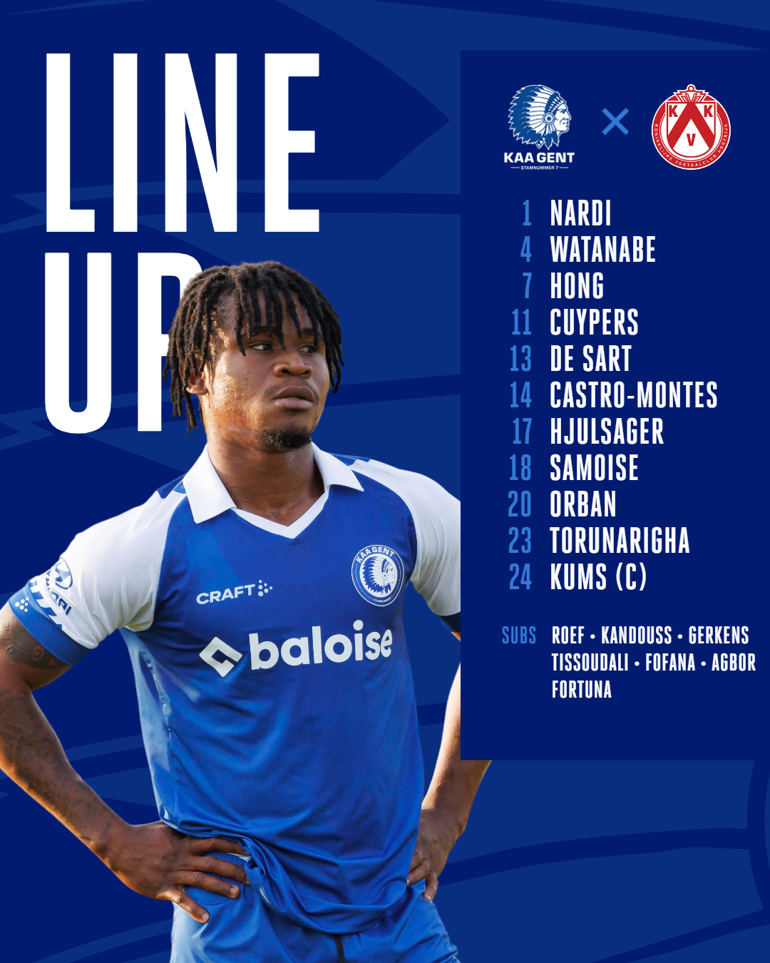 De opstelling van KAA Gent, u aangeboden door Canon: Nardi, Watanabe, Torunarigha, Castro-Montes, Samoise, Kums, De Sart, Hong, Hjulsager, Orban, Cuypers.
