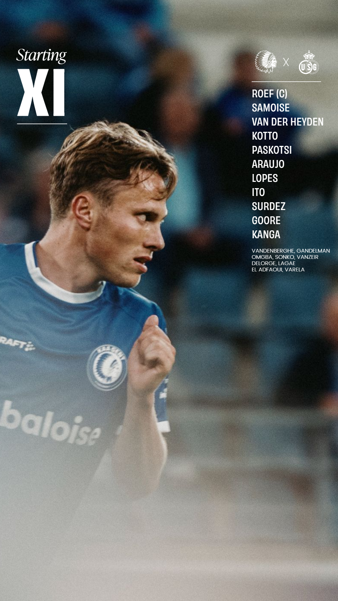 De opstelling van KAA Gent, u aangeboden door Canon: Roef, Van Der Heyden, Kotto, Paskotsi, Samoise, Araujo, Lopes, Ito, Surdez, Goore, Kanga.